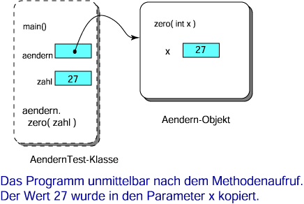 Java verwendet Call-By-Value für die Parameterübergabe, das bedeutet, dass bei der Verwendung einer Variablen als Parameter der Inhalt (der Wert) einer Variable an eine Methode übergeben wird. Die Abbildung zeigt das Wiederholungsprogramm unmittelbar nach dem Methodenaufruf.