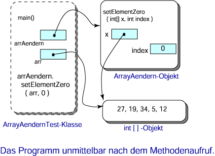 ausgeführt wird, der Parameter x der Methode setElementZero() eine Kopie des Werts bekommt, der in der Variablen arr enthalten ist, und dieser Wert ist eine Referenz auf das Array.