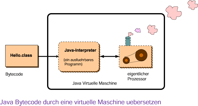 Jedes Computersystem kann Java Bytecode Programme ausführen, wenn es einen Java Interpreter hat. Der Java Interpreter muss speziell für den bestimmten Prozessortyp des Computersystems geschrieben sein, aber wenn das geschehen ist, kann das Computersystem eine Java Virtuelle Maschine werden. Das heißt, es verhält sich wie ein Computer mit einem Java Hardware Prozessorchip der Java Bytecode ausführen kann.