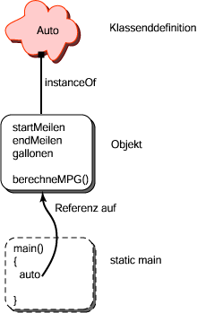 Die Abbildung zeigt die Variable auto in der statischen main() Methode, die auf das konstruierte Objekt verweist, indem sie dem Plan folgt,