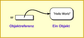 Sobald es existiert, kann darauf über seine Referenz zugegriffen werden. Oft wird die Referenz in einer Referenzvariablen wie str gehalten. Zum Beispiel, das Folgende deklariert zuerst eine Referenzvariable, konstruiert dann ein Objekt und stellt die Referenz darauf in str: